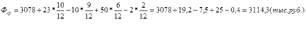 Ф'к = Ф'н +П - В' – Ар = 50,2 – 10,04 + 7,8 – 0,45 – 4,016 = 43,494(млн. руб.)