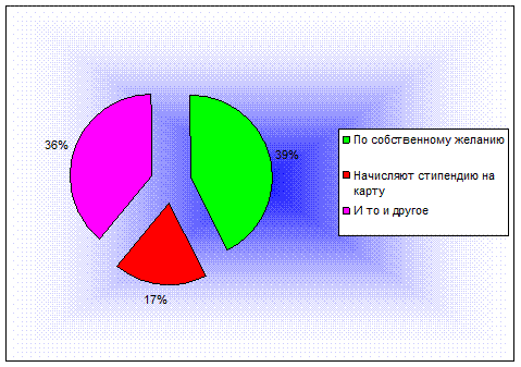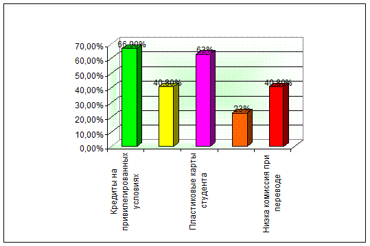 Как мы видим, наибольшее количество студентов хотели бы пользоваться Интернет-банкингом и телефонным банкингом. Объясняется это довольно просто : в последнее время довольно активно развивается рынок высокоскоростных и безлимитных Интернет-тарифов, и у многих студентов есть доступ к Интернет-ресурсам, не говоря уже о наличии одного и более мобильных телефонов у студентов. Безусловно, Интернет- и телефонный банкинг очень удобен. Человек получает возможность проводить платежи практически в реальном режиме времени, оплатить коммунальные услуги, приобрести интернет-ресурсы провайдеров, операторов IP-телефонии, пополнить платежный баланс сотового телефона, зачислить средства в "электронный кошелек" интернет-платежных систем, быстро и безопасно оплатить товары/услуги в электронном магазине, а также получать все информацию посредством смс-рассылок.