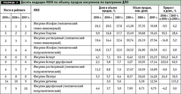 В настоящее время в России зарегистрированы инсулины двух типов: свиные монокомпонентные и человеческие. За исследуемый период по программе ДЛО свиные монокомпонентные инсулины были проданы только в 2005 г. на сумму менее 300 долл. В рейтинге продаж инсулинов по МНН (табл. 2