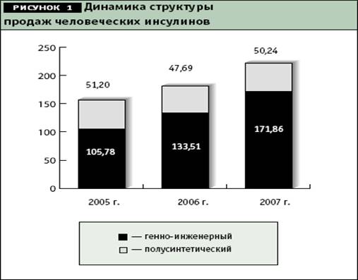 Объемы продаж полусинтетических инсулинов практически стабильны, рост продаж происходит за счет постоянно возрастающей части генноинженерных инсулинов.