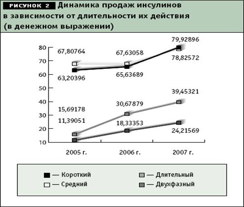 ). Следует отметить, что ввиду кризиса реализации программы ДЛО в 2006 году произошло падение продаж инсулинов в натуральном выражении, однако прирост за 2 года все же составил более 4%.