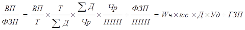 где ВП — выпуск продукции в действующих ценах; ФЗП — фонд заработной платы персонала; Т — количество часов, затраченных на производство продукции; — количество отработанных дней соответственно всеми рабочими и одним рабочим за анализируемый период; Чр — среднесписочная численность; платы рабочих; ППП — среднесписочная численность промышленно-производственного персонала; ЧВ — среднечасовая выработка продукции; П — средняя продолжительность рабочего дня; Уд — удельный вес рабочих в общей численности персонала; ГЗП — среднегодовая зарплата одного работника.