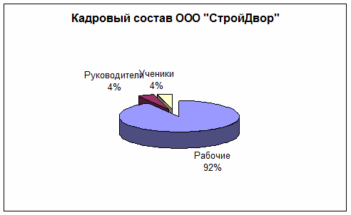 Как показано в таблице 1.1, кадровый состав ООО «СтройДвор» претерпел за год (с 2009 года по 2010 год) незначительные изменения. Основную часть работающего персонала составляют рабочие (90%), ученики - 4%. Для наглядности соотношение кадрового состава представлено диаграммой.