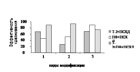 При модификации исследуемыми ЗГ и ОГЗС установлена, рис. 1, большая эффективность при обработке волокна ванной, содержащей смесь ЗГ (Т‑2+ПФ)+ПСХД и этот эффект сохраняется при всех способах модификации. Вместе с тем, следует отметить, что предварительная термическая обработка немодифицированного ПАН волокна при температуре 100°С, а также пропитка его ванной с температурой 85°С незначительно изменяют эффективность сорбционного взаимодействия ЗГ с ПАН волокном.