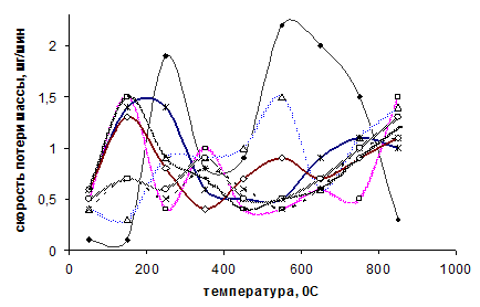Рис. 2. Скорости потери массы исходных и модифицированных ПАН волокон: 1 –