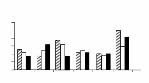 Рис. 3. Зависимость физико-механические показателей образцов ПАН волокна от состава модифицирующей ванны: 1 – 20 Т‑2 +ПСХД, 2 – 20 ПФ+ПСХД; 3 – 30 ПФ+ПСХД; 4 – 20 (Т‑2+ПФ)+ПСХД; 5 – 30 (Т‑2+ПФ)+ПСХД; 6 – 30 Т‑2 +ПСХД