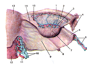 1 - маточная труба; 2 - надъяичник (придаток яичника); 3 - яичниковая артерия; 4 - бахромка трубы (маточной); 5 - связка, подвешивающая яичник; 6 - артерии и вены яичника; 7 - яичник; 8 - круглая связка матки; 9 - широкая связка матки; 10 - маточные вены; 11 - маточная артерия; 12 - влагалише; 13 - матка; 14 - собственная связка яичника; 15 - яичниковая ветвь маточной артерии.