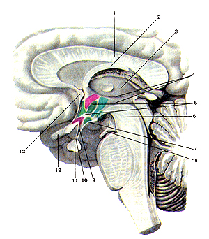 1 - мозолистое тело; 2 - свод; 3 - таламус; 4 - третий желудочек; 5 - гипоталамус; 6 - средний мозг; 7 - серый бугор; 8 - глазодвигательный нерв; 9 - воронка; 10 - инфундибулярная часть гипофиза; 11 - гипофиз; 12 - перекрест зрительный нервов; 13 - передняя (белая) спайка.