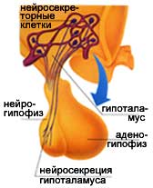Кроме своих функций, связанных с нервной системой, гипоталамус выполняет также эндокринную функцию, так как его нервные клетки высвобождают нейрогормоны, вырабатываемые не собственно эндокринной железой. Два из них хранятся в гипофизе: окситоцин, регулирующий сокращения матки во время родов, и вазопрессин, или антидиуретический гормон, регулирующий водный обмен и стимулирующий обратную резорбцию воды в почках и сужающий сосуды.