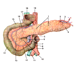 1 - тело поджелудочной железы; 2 - селезеночная артерия; 3 - селезеночная вена; 4 - хвост поджелудочной железы; 5 - верхняя брыжеечная артерия; 6 - верхняя брыжеечная вена; 7 - восходящая часть двенадцатиперстной кишки; 8 - нижняя брыжеечная артерия; 9 - аорта; 10 - крючковидный отросток поджелудочной железы; 11 - нижняя (горизонтальная) часть двенадцатиперстной кишки; 12 - нижняя поджелудочно-двенадцатиперстная артерия; 13 - головка поджелудочной железы; 14 - нисходящая часть двенадцатиперстной кишки; 15 - верхняя (горизонтальная) часть двенадцатиперстной кишки; 16 - верхняя поджелудочно-двенадцатиперстная артерия; 17 - пилорический отдел желудка (отрезан); 18 - нижняя полая вена; 19 -аорта.