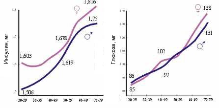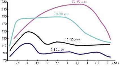 Так, на рис.16 показана выраженность гипергликемии и скорость ее устранения при двойной глюкозной нагрузке у людей разного возраста.