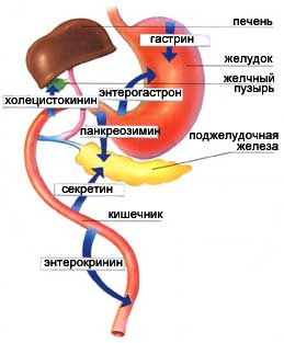 В двенадцатиперстной кишке вырабатываются панкреозимин и секретин, стимулирующие выделение поджелудочного сока, а также холецистокинин, способст-вующий выбросу желчи при поступлении жирных веществ.