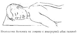При отравлениях велика возможность рвоты, поэтому пострадавшего укладывают на живот головой набок,
