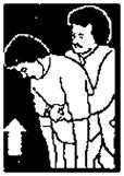 Если пострадавший может стоять, поверните его спиной к себе и выполните прием Хаймлиха: обхватив пострадавшего сзади в положении стоя, надавите кулаком на область желудка; вторую руку