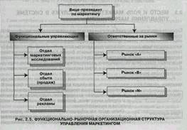 В связи с этим различают в зависимости от функционального признака организационную структуру управления, специализирующуюся на обособленных видах маркетинговых работ (маркетинговые исследования, сбыт, реклама и т.д.) (рис. 2.3).