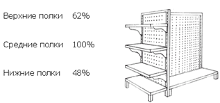 Если принять показатель продаж (товарооборот) по средним полкам за 100%, то продажи по верхним полкам составляют 62% от объема реализации товара, в случае его размещения на средних полках. Объем реализации с нижних полок составит 48%.