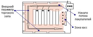 2) Принцип чересполосицы. Известен принцип чересполосицы, при котором товары с низкими ценами и товары, приносящие магазину наибольшую прибыль, чередуются по ходу движения покупателя в торговом зале. Дорогой товар не должен быть загнан в конец маршрута, так как покупатель может, дойдя до него, уже заполнить свою корзину.