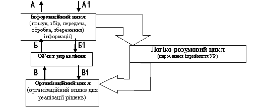 Технологія прийняття рішення у процесі управління поділяється на три основних цикли (рис. 1.2): інформаційний (пошук, збір, передача, обробка, збереження інформації; логіко-розумовий (вироблення і прийняття УР); організаційний (організація виконання УР).