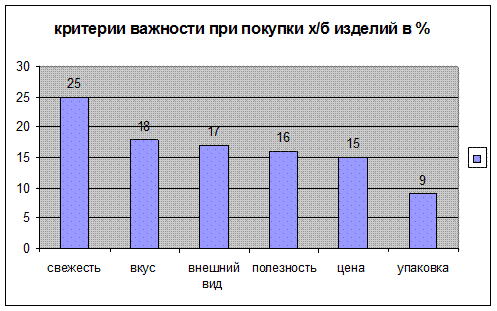 Для улучшения вкуса и аромата добавляются ароматические вещества и пряности (ванилин, корица, мята, тмин и т.д.). Внешний вид изделия привлекателен для покупателя. В результате маркетингового исследования, проведенного Отделом маркетинга и развития в 2008 году, выяснилось, что наиболее важными критериями (Рис. 6) при покупке хлеба являются: свежесть (25%), вкус (18%), внешний вид (17%), полезность (16%), цена (15%), упаковка (9%)