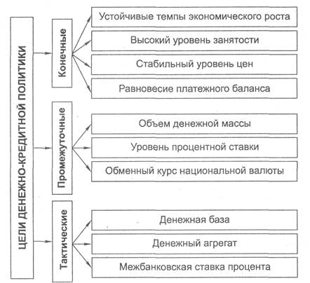 Конечные цели реализуются денежно-кредитной политикой как одним из направлений экономической политики в целом, наряду с фискальной, валютной, внешнеторговой, структурной и другими видами политики. Промежуточные цели непосредственно относятся к деятельности Центрального (Национального) банка и осуществляются в рыночной экономике с помощью в основном косвенных инструментов.