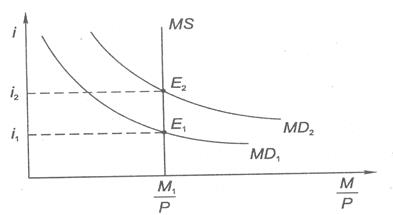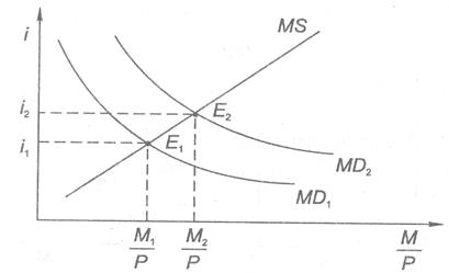 приводит к увеличению количества денег с до и повышению ставки процента с i