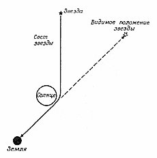 Лучи света тоже должны следовать геодезическим в пространстве-времени. Искривленность пространства означает, что свет уже не распространяется прямолинейно. Таким образом, согласно обшей теории относительности, луч света должен изгибаться в гравитационных полях, и, например, световые конусы точек, находящихся вблизи Солнца, должны быть немного деформированы под действием массы Солнца. Это значит, что луч света от далекой звезды, проходящий рядом с Солнцем, должен отклониться на небольшой угол, и наблюдатель, находящийся на Земле, увидит эту звезду в другой точке (рис. 2.9). Конечно, если бы свет от данной звезды всегда проходил рядом с Солнцем, мы не могли бы сказать, отклоняется ли луч света или же звезда действительно находится там, где мы ее видим. Но вследствие обращения Земли все новые звезды заходят за солнечный диск, и их свет отклоняется. В результате их видимое положение относительно остальных звезд меняется.