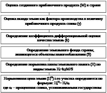 На основании земельной ренты и цены земли устанавливаются земельный налог и нормативная цена земли. Нормативная цена земли используется при передаче земли в собственность, передаче по наследству, дарении, получении банковского кредита под залог земельного участка и в некоторых других случаях. Последовательность расчета нормативов платы за землю и цены земли показана на рис. 2.