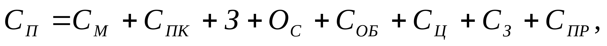 (2) где СМ – затраты на материал, руб.; CПК – затраты на покупные изделия, руб.; З – затраты на основную и дополнительную заработную плату производственным рабочим, руб.; ОС – единый социальный налог, руб.; СОБ – расходы на содержание и эксплуатацию оборудования, руб. СЦ– цеховые расходы, руб.; СЗ – общезаводские расходы, руб.; СПР – прочие расходы, руб.