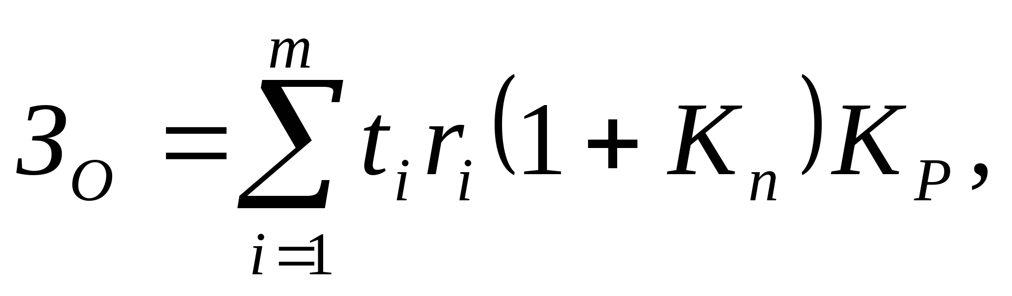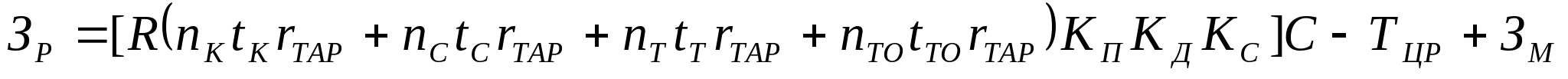 (9) где R – категория ремонтной сложности оборудования; nK, nC, nТ, nТО, - количество капитальных, средних, текущих ремонтов и осмотров в ремонтном цикле; tК, tС, tТ, tТО – затраты времени соответственно на капитальный, средний, текущий ремонт и осмотр на единицу ремонтной сложности; rТАР - средняя часовая тарифная ставка ремонтников; КП- коэффициент премиальных доплат (1,4 - 1,7); КД=1,18 - коэффициент дополнительной заработной платы; КС=1,26 - коэффициент на единый социальный налог; С - количество единиц однотипного оборудования; ТЦР – продолжительность ремонтного цикла оборудования; ЗМ – затраты на материалы.
