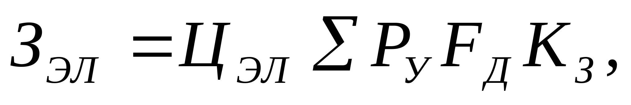 (8) где ЦЭЛ – цена 1 кВт ч электроэнергии, руб.; РУ – установленная мощность оборудования, кВт; FД – действительный фонд времени работы оборудования, ч; КЗ – коэффициент загрузки оборудования.