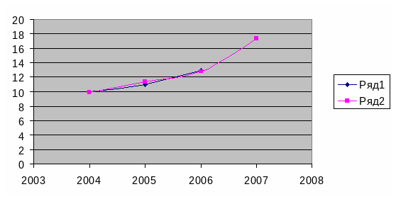 Таблица 3. Структура динамики затрат | Наименование показателя | 2005 год | 2006 год | 2007 год | Изменения 2007 к 2006 году | | Сумма, тыс. руб. | Уд. вес, % | Сумма, тыс. руб. | Уд. вес, % | Сумма, тыс. руб. | Уд. вес, % | Сумма, тыс. руб. | Уд. вес, % | | Затраты на оплату труда | 972 | 25 | 1037 | +20 | 1229 | +23 | 192 | +17 | | ЕСН | 917 | 24 | 920 | +33 | 1030 | +31 | 110 | +11 | | Амортизация | 98 | 3 | 96 | +2 | 92 | +2 | 4 | -4 | | Прочие затраты | 1894 | 49 | 1973 | +40 | 2659 | +44 | 427 | +35 | | Итого: | 3881 | 100 | 4026 | 100 | 5010 | 100 | 984 | +20 |