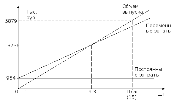 , (13) где С – постоянные расходы, тыс. руб.; k – доля рассматриваемой продукции в формировании прибыли предприятия; Р=348 – цена единицы продукции, тыс. руб.; V=246– переменные затраты на единицу продукции, тыс. руб. К постоянным затратам относят годовой фонд заработной платы и арендную плату за используемые помещения 96 тысяч рублей в год. шт. Для обеспечения безубыточной работы предприятию необходимо реализовать в 2009 г. более 9 станков СНЭ-20МК. На рисунке 4 приведен график безубыточности.  Рисунок 5. График безубыточности станка СНЭ-20МК 3.7 Изменение финансовых показателей предприятия в результате модернизации станка СНЭ-20М до СНЭ-20МК