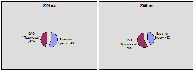 На деятельность любого предприятия по формированию ассортимента оказывает влияние ряд объективно действующих факторов. В дипломной работе были рассмотрены как общие, так и специфические факторы, определяющие построение ассортимента. Одним из немаловажных факторов, оказывающих влияние на деятельность фирмы, является качественный состав аппарата управления фирмы. Особое значение приобретает такой фактор как расположение города и ОАО в нем. За время своего существования фирма достойно заняла свое место на местном рынке. Об этом может свидетельствовать доля рынка, занимаемая предприятием в общем товарообороте обслуживаемого сегмента (таблица 3.1.2). Так в 2005 году по сравнению с 2003 доля рынка, занимаемая ОАО «Продтовары» возросла до 58,6%, увеличение составило 19,9 процентных пункта (таблица 3.1.3).
