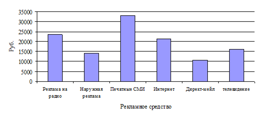 Как видно из таблицы 39, рекламный бюджет ООО «Рекламное агентство» рассчитан на 66949 рублей. На рисунке 13 показано распределение бюджета по рекламным средствам.
