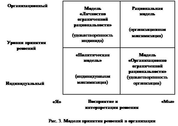 В зависимости от того, как процесс принятия управленческого решения воспринимается и интерпретируется на разных уровнях – индивидуальном или организационном, выделяют четыре модели принятия решений: политическую, личностно ограниченной рациональности, рациональную и организационно ограниченной рациональности (рис. 3).