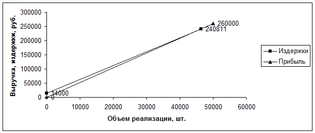 Точка безубыточности наступает при Выручке – 240811 рублей, и объеме продаж 46309 шт.