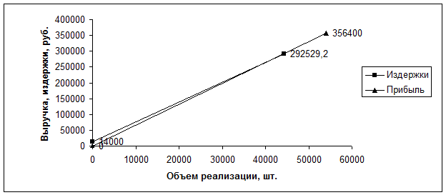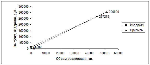 Точка безубыточности наступает при Выручке – 267275 рублей, и объеме продаж 45300 шт.