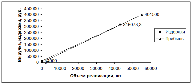 Точка безубыточности наступает при Выручке – 316073,3 рубля, и объеме продаж 43299 шт.