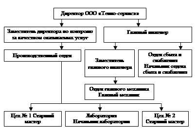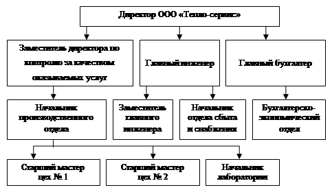 Структура управления любого предприятия, в том числе и ООО «Тепло-сервис», направлена, прежде всего, на установление четких взаимосвязей между отдельными подразделениями предприятия, распределение между ними прав и ответственности. В ней реализуются различные требования к совершенствованию системы управления, находящие выражение в тех или иных принципах управления. Структуру управления обычно изображают в виде схемы. Схема структуры управления ООО «Тепло-сервис» представлена на рис. 1 - Структура управления ООО «Тепло-сервис».