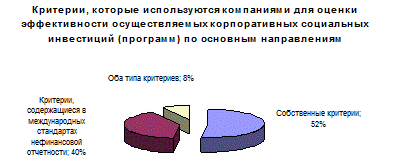 В институционализации социального инвестирования наиболее благоприятная ситуация наблюдается в области оформления социальной отчетности (подготовка отчетов в соответствии с международными стандартами, регулярность нефинансовой отчетности), а наименее позитивная картина – с точки зрения учета и оценки эффективности реализуемых компаниями мероприятий. Более половины компаний (52%) используют собственные критерии для оценки эффективности социальных инвестиций, и менее половины (40%) – в соответствии с международными стандартами (рис. 3).