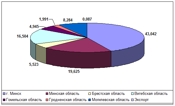 Доля реализованного пива ОАО Криница» в регионах РБ и на экспорт указаны на следующей диаграмме: