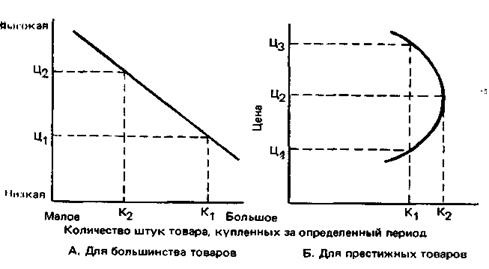 Большинство кривых спроса стремится вниз по прямой или изогнутой линии, как показано на рис. 59а. Однако в случаях с престижными товарами кривая спроса иногда имеет положительный наклон типа представленного на рис. 596. Парфюмерная фирма обнаружила, что, повысив цену с Ц1
