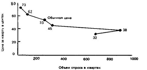 Для замера спроса необходимо провести его оценку при разных ценах. На рис. 60 представлена оценка спроса на моторное масло «Квакер стейт». Спрос растет по мере снижения цены с 73 до 38 центов. Однако на уровне 32 центов он начинает падать, ибо люди думают, что масло слишком дешевое и может нанести ущерб автомобилю.
