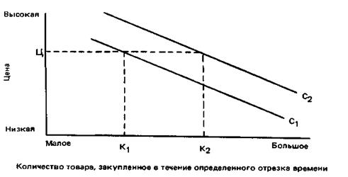 Экономисты установили, что под влиянием неценовых факторов происходит сдвиг кривой спроса, а не изменение ее формы. Предположим, что начальный уровень спроса представлен на рис. 61 кривой C1