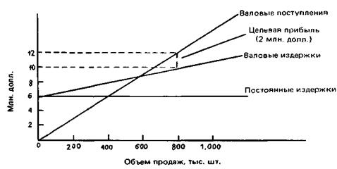 Методика ценообразования с расчетом на получение целевой прибыли основывается на графике безубыточности. На таком графике представлены общие издержки и ожидаемые общие поступления при разных уровнях объема продаж. Гипотетический график безубыточности показан на рис. 64. Независимо от объема сбыта постоянные издержки равняются 6 млн. долл. Валовые издержки (сумма постоянных и переменных издержек) растут одновременно с ростом сбыта. Кривая валовых поступлений начинается с нулевой отметки и поднимается вверх по мере увеличения числа проданных единиц товара. Крутизна наклона кривой валовых поступлений зависит от цены товара. В нашем примере цена товарной единицы равняется 15 долл. (из расчета получения 12 млн. долл. за 800 тыс. штук проданного товара).