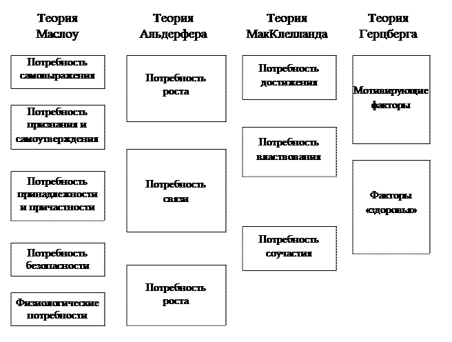 Так называемые теории содержания мотивации основное внимание уделяют тому, как различные группы потребностей оказывают влияние на поведение человека. Широко признанными концепциями этой группы являются теория иерархии потребностей Маслоу, теория ERG Альдерфера, теория двух факторов Герцберга и теория приобретенных потребностей МакКлелланда. Несмотря на принципиальные отличия этих концепций, они тем не менее имеют нечто общее в своей основе, что отражает определенную общность в мотивации человека к действиям.