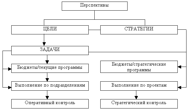 На рис.2. представлена схема стратегического планирования, которая демонстрирует, что перспективы и цели связаны между собой для выработки стратегии. Текущие программы (бюджеты) ориентируют оперативные подразделения фирмы в их повседневной работе, направленной на обеспечение текущей рентабельности, стратегические программы и бюджеты закладывают основы будущей рентабельности, что требует создания специальной системы исполнения, построенной на управлении проектами.
