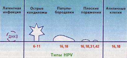 Разные типы пвч вызывают отличающиеся друг от друга заболевания (см. приложение). Риск злокачественного перерождения связан с несколькими типами впч: 16(50-70%) , 18(10-20% ), 31, 33, 35, 39, 45, 51, 52, 56, 58, 59, 68. Вирусами низкого риска онкогенного заболевания являются 5 типов впч – 6, 11, 42-44. Отмечено, что 16 тип наиболее часто встречается в ткани высоко дифференцированного плоскоклеточного рака шейки матки, а 18 тип – в ткани с плоскоклеточными опухолями низкой степени дифференцировки и железистого рака-аденокарциномы. Онкогенные вирусы всегда персистируют, неонкогенные - редко. Число копий на клетку при поражении онкогенным впч 111,5, а при поражении неонкогенным впч – 3,8.