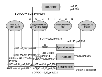 Особливо часто ЦД 2-го типу та асоційовані з атеросклерозом ССХ виникають на фоні метаболічного синдрому (МС), який поєднує у собі такі фактори ризику їх розвитку, як ожиріння, артеріальна гіпертензія (АГ), інсулінорезистентність (ІР), гіперглікемія, дисліпідемія, ендотеліальна дисфункція, прозапальний та протромботичний стан (A. Festaetal., 2000; N. Sattaretal., 2003; Є.Х. Заремба та ін., 2003; О.В. Коркушко та ін., 2003; О.І. Мітченко, 2007). МС також асоціюється з іншими хворобами, зокрема з неалкогольною жировою хворобою печінки (НАЖХП) (S. Chitturi, G.C. Farrell, 2001; G. Paganoеtal., 2002). Частота випадків ожиріння та МС постійно зростає в світі (А.С. Аметов и др., 2001; S.H. Wildetal., 2004). Тому опрацювання методів раннього виявлення МС та асоційованих з ним розладів і хвороб має важливе медичне та соціальне значення.