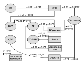 Вперше при МС вивчено маркери гіперкоагуляції. Виявлено обернений зв'язок між концентраціями РФМК та холестерину ліпопротеїнів високої густини (ХС-ЛПВГ), який свідчить про те, що серцево-судинний ризик, асоційований з характерною для МС атерогенною дисліпідемією, частково опосередкований гіперкоагуляцією та протромботичним станом. Встановлені асоціації між активацією системи зсідання крові та метаболічними розладами, гіпертензією, порушенням функції серця, а також ризиком гострих серцево-судинних ускладнень дозволили виділити предиктори виникнення ССХ, пов’язані з МС.